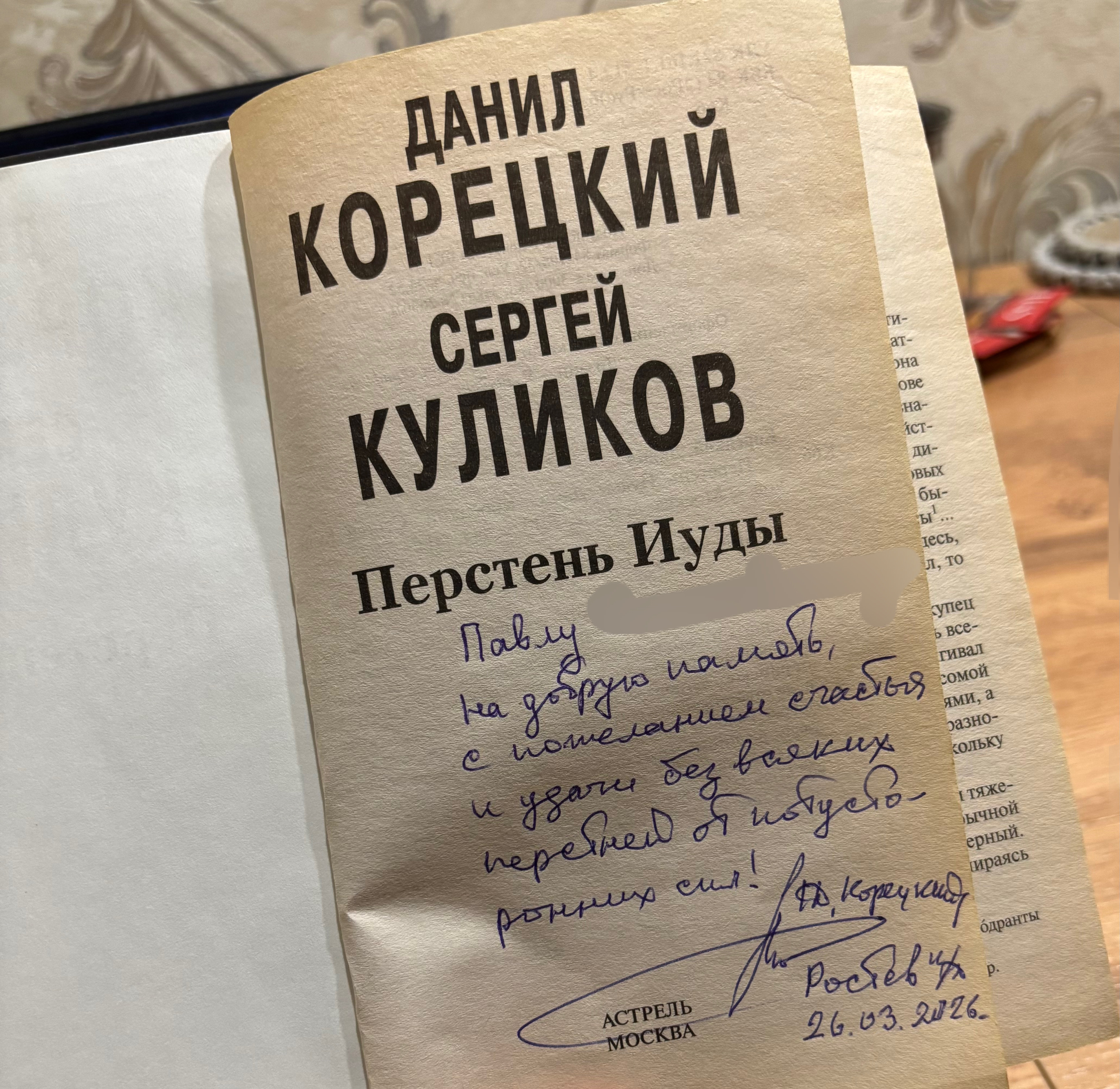 Одну из своих книг, изданную в 2012 году, Данил Корецкий любезно подписал для редактора сайта «Южная служба новостей». «Павлу. На добрую память, с пожеланием счастья и удачи без всяких перстней от потусторонних сил!», – гласит послание на титульном листе.