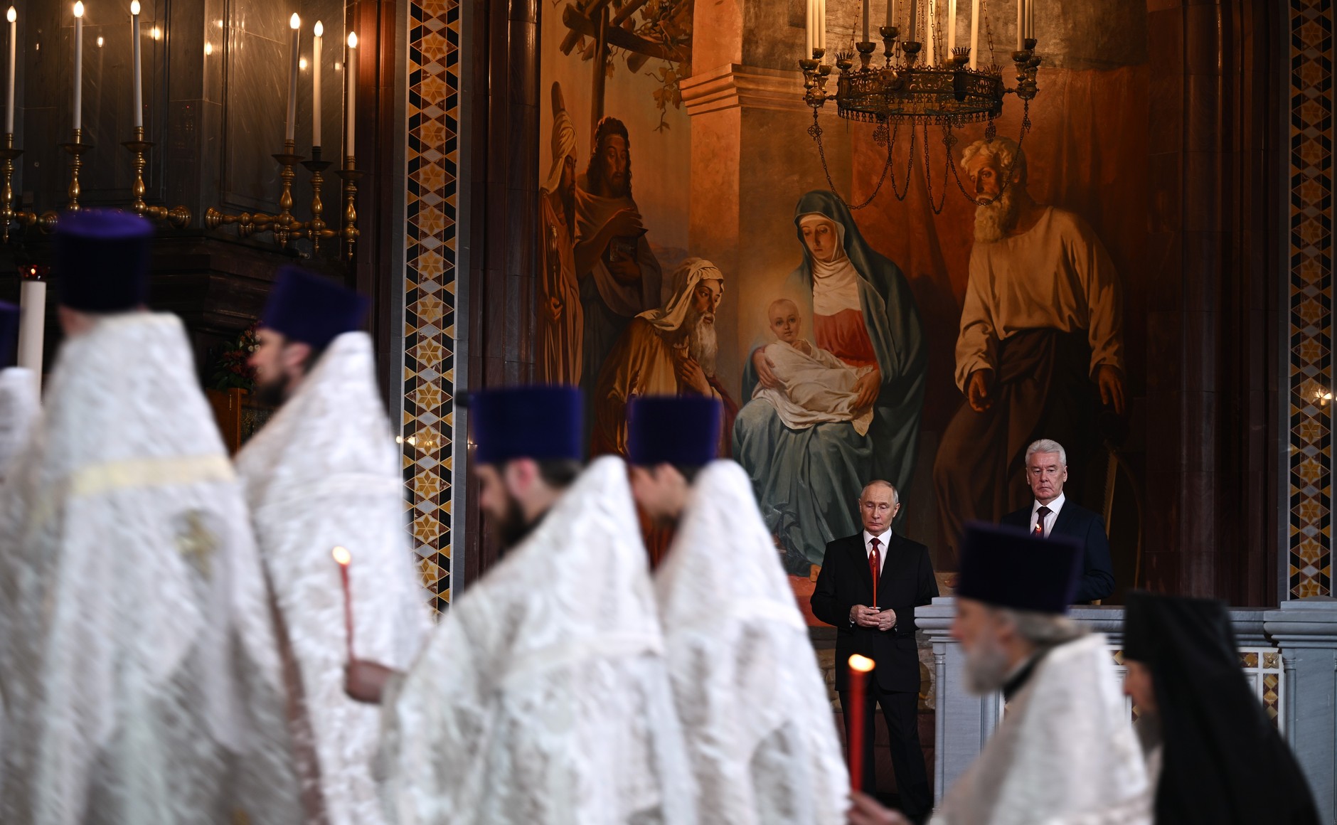 В ночь на Пасху Владимир Путин вместе с мэром Москвы Сергеем Собяниным присутствовал на праздничном богослужении в храме Христа Спасителя, которое совершил Патриарх Московский и всея Руси Кирилл.